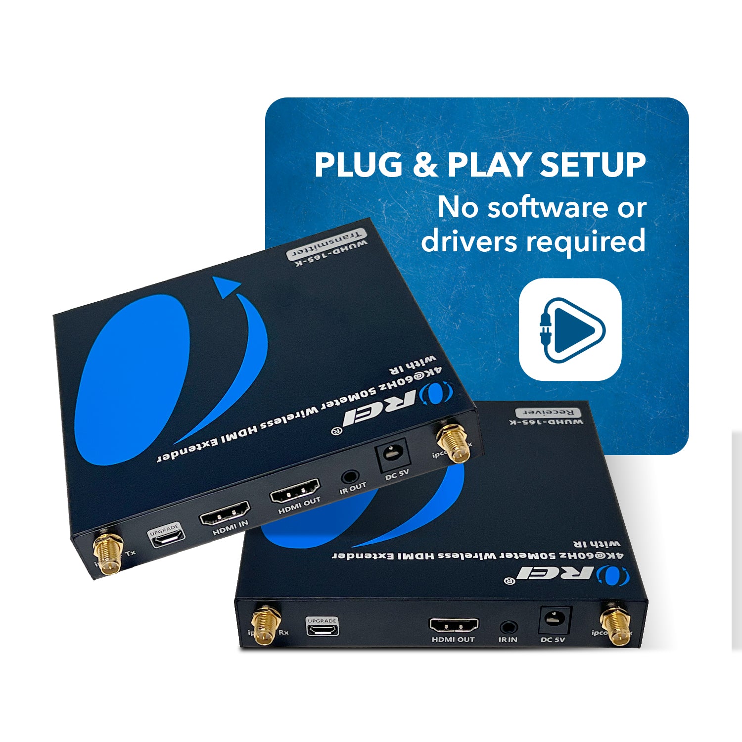 The WUHD-165-K HDMI wireless extender transmits stunning 4K@60Hz video up to 165 feet (50 meters) in clear line-of-sight conditions. Perfect for home theaters, conference rooms, or classrooms, this wireless HDMI transmitter eliminates cable clutter while maintaining exceptional video quality and reliability.